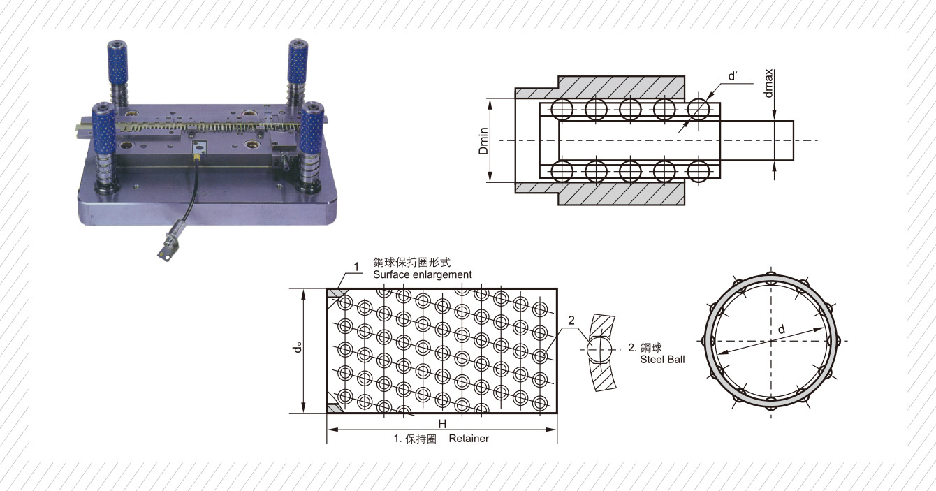 传统的具有相对运动的孔与轴是有一定间隙的,并孔与轴之间运动磨擦系数较大,使用钢球保持圈后,使轴与孔不直接接触,而是通过中间微量过盈的钢球,因而运动精度高,滚动摩擦代替动摩擦,滚动灵活,摩擦系数小,使用寿命长,在既有转动、又有移动的场合,用无油或加油的轴套与轴相配合,虽然能满足,但运动精度较低,用滚动轴承,只能满足轴相对转动的场合,而钢球保持圈,则上述二个条件均得到满足,目前已广泛应用于冷冲模滚动模架、高精度机床、机床附件以及要求高精度轴向或轴径向同时运动场合。
